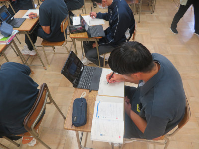 接続時の操作に戸惑っていた生徒たちも、授業が始まるといつもと違う雰囲気の中、いつもと違う先生の授業を真剣なまなざしで取り組み、とても有意義な時間を過ごすことができました。
