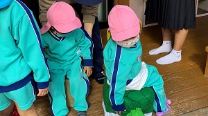 記念撮影では、椅子の取り合いになる場面も…「じゅんばん、じゅんばん、こうたいだよ。」とお兄ちゃんやお姉ちゃんのいういうこともきちんと聞ける園児さんたちでした。